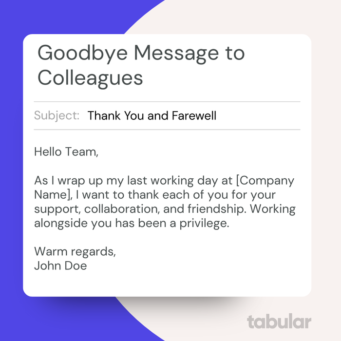 General Goodbye Message to Colleagues on Your Last Working Day